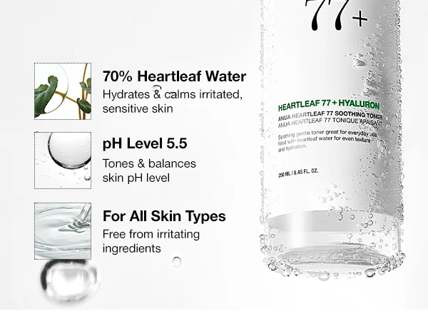 1. Suitable for All Skin TypesThis toner is formulated to be gentle and safe for all skin types, including sensitive, acne-prone, oily, combination, dry, and even reactive skin. Its lightweight, fragrance-free formula ensures broad compatibility. 2. Captivating Marketing Description“Experience a wave of tranquility for your skin with Anua Heartleaf 77 Soothing Toner. Infused with a remarkable 77 % heartleaf extract, this feather-light mist delivers instant hydration and calm, erasing redness and irritation like a serene breath of fresh air. Think of it as your everyday rescue potion—quietly effective, deeply soothing, and ready to rescue your complexion, day or night.” 3. Benefits