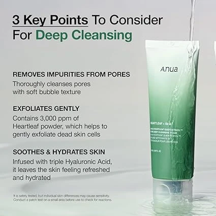 Suitable for All Skin TypesPrimarily designed for oily, combination, and acne-prone skin, this foam is also gentle enough for normal and sensitive skin when used carefully. “Unleash the power of purity with Anua Heartleaf Quercetinol™ Pore Deep Cleansing Foam—a light, velvety foam that dives deep to cleanse pores, soothe irritation, and refine texture. Infused with potent Quercetinol™, an antioxidant extracted from heartleaf, plus gentle 0.5% BHA (salicylic acid) and Anti‑Sebum P, this cleanser delivers a balanced blend of calming relief and powerful deep cleansing in every wash.” Benefits