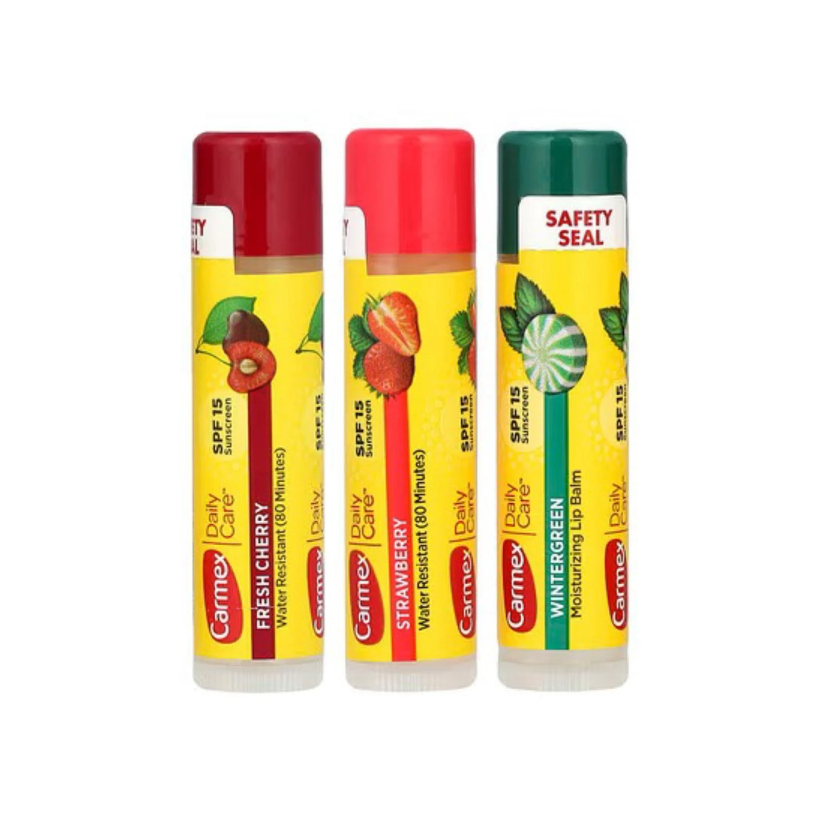 Suitable for Any Skin TypeSafe and suitable for all skin types, including sensitive lips. Keep your lips soft, smooth, and protected every day with Carmex Daily Care Lip Balm. This 3-pack features refreshing flavors – Fresh Cherry, Strawberry, and Wintergreen – for a delightful lip care experience. Enriched with moisturizing ingredients and SPF 15 sunscreen, Carmex provides lasting hydration while shielding your lips from sun damage. Perfect for daily use, whether at home, work, or on the go. Benefits