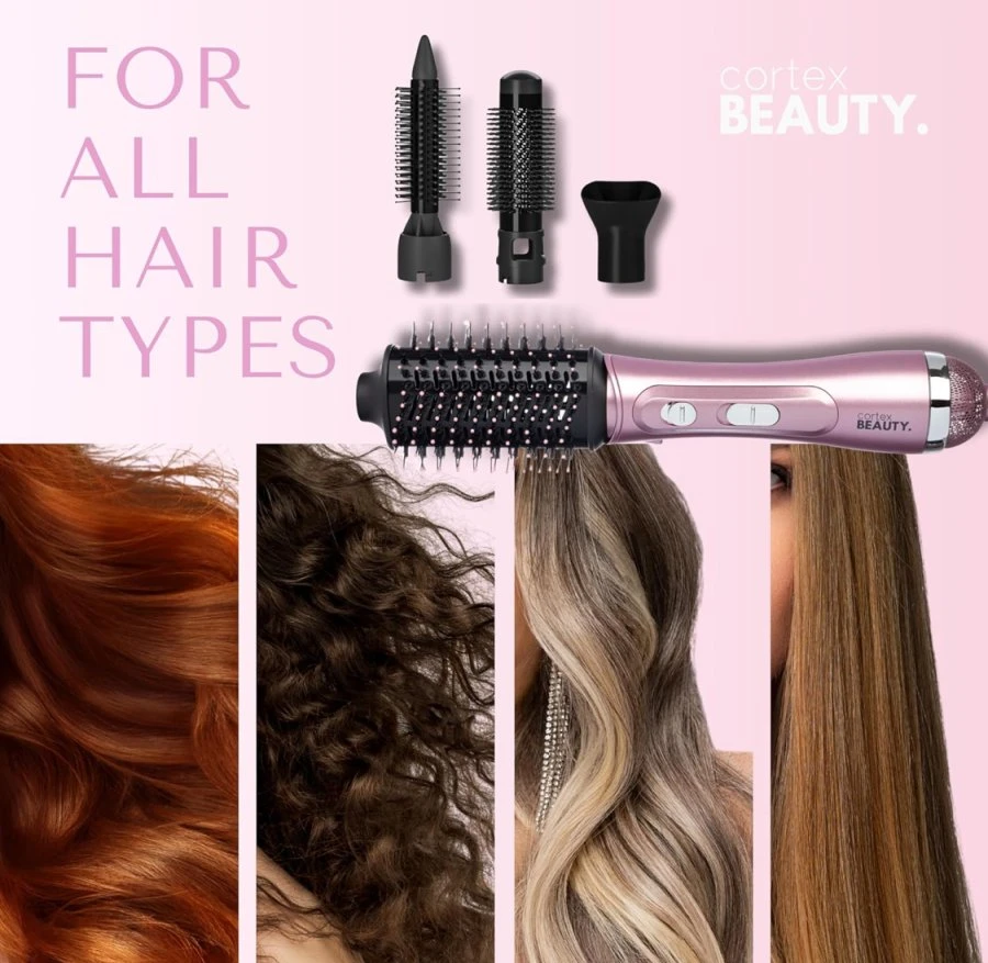 The Cortex Beauty 4-in-1 Air Styler is the ultimate all-purpose styling tool designed to give you salon-quality results at home. With four interchangeable attachments, it combines the power of a blow dryer with the precision of styling brushes, allowing you to dry, smooth, curl, and add volume effortlessly. Whether you want sleek straight hair, bouncy curls, or voluminous waves, this versatile tool makes styling easy and efficient while protecting your hair’s natural shine. Key Features and Benefits: