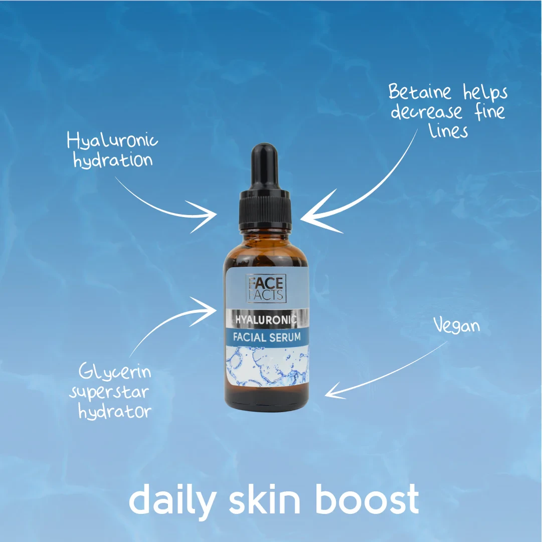 Marketing Description: Discover the power of deep hydration with Face Facts Hyaluronic Facial Serum, enriched with Betaine, Sodium Hyaluronate, and Glycerin. This lightweight formula helps soothe and soften your skin, leaving it plump, refreshed, and radiant. Benefits: Provides intense hydration and moisture retention. Helps soothe and calm irritated skin. Softens and smooths skin texture. Improves skin elasticity and suppleness. Supports a healthy-looking, radiant complexion. Suitable for: All skin types, including sensitive skin. Suitable Areas of Use: Primarily for the face, including cheeks, forehead, chin, and around the nose. Avoid direct application on the delicate eye area unless recommended. How to Use: Cleanse and dry your face. Apply a few drops of the serum to your fingertips. Gently massage onto the skin in upward circular motions until fully absorbed. Follow with your moisturizer or day/night cream. For best results, use morning and evening. Warnings: For external use only. Avoid direct contact with eyes; if contact occurs, rinse thoroughly with water. Discontinue use if irritation or redness occurs. Keep out of reach of children. Store in a cool, dry place away from direct sunlight. |