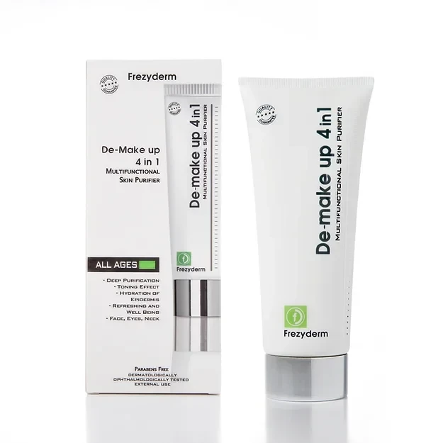 Frezyderm De-Make Up 4 in 1 is a versatile and gentle cleansing solution that performs four essential skincare actions in one step. This advanced micellar water effectively removes makeup from the face, eyes, and lips, deeply cleanses the skin, tones it, and offers soothing care. Its gentle, dermatologically tested formula refreshes and hydrates the skin without leaving residue, making it ideal for daily use and sensitive skin. Perfect for those seeking a quick and effective cleansing routine with a single product. Key Benefits: