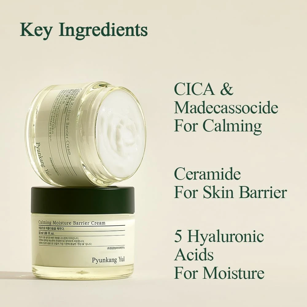 Pyunkang Yul Calming Moisture Barrier Cream delivers gentle hydration and calming care in a soothing balm-like texture that absorbs quickly. Powered by Centella Asiatica, honeysuckle and tea tree extracts for anti-inflammatory and antimicrobial action, plus ceramides, squalane, shea butter, and five types of hyaluronic acid, this cream helps restore the skin barrier, reduce redness, regulate sebum, and reveal calmer, more resilient skin. Fragrance-free, vegan, non‑comedogenic, and free of harsh chemicals.