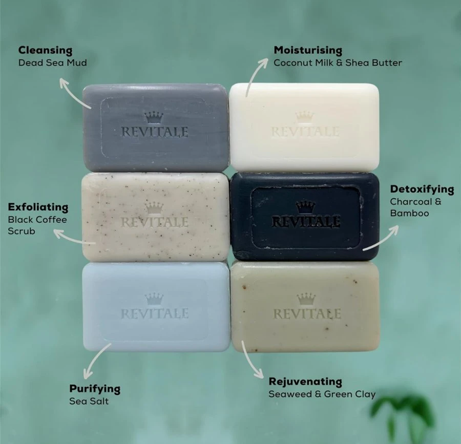 Experience a full spectrum of skincare benefits with the Revital Soap Collection Set. Featuring six premium handcrafted soaps, each bar is designed to target specific skin needs—whether you're cleansing, moisturizing, detoxifying, or exfoliating. Infused with natural ingredients like coconut oil, shea butter, dead sea mud, charcoal, bamboo, and black coffee scrub, this set is your daily escape into nature's healing touch. Beautifully boxed and perfect for personal use or gifting. Key Benefits: