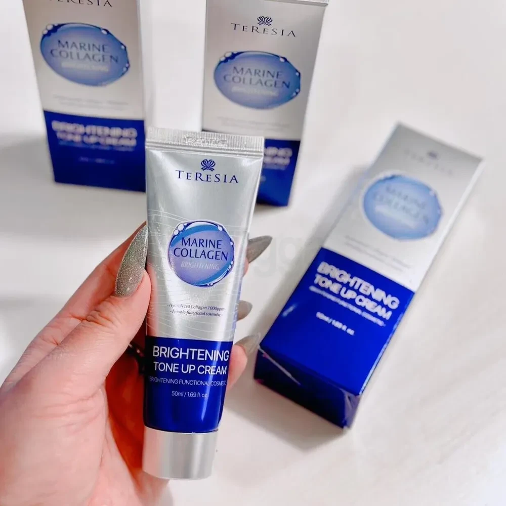 The TERESIA Marine Collagen Brightening Tone Up Cream is a dual-function cosmetic that combines the power of hydrolyzed marine collagen (1000 ppm) with brightening ingredients to deliver both hydration and radiance. This lightweight cream instantly tones up the complexion, leaving skin brighter, smoother, and more luminous. With continued use, it helps improve skin elasticity while reducing dullness and uneven tone. Benefits