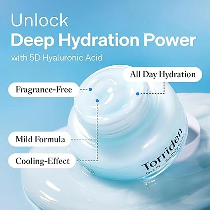 Suitable ForThis cream is suitable for all skin types, including sensitive and dehydrated skin. Its lightweight texture makes it especially good for oily/combination skin that still needs hydration without heaviness. Discover deep hydration with Torriden DIVE-IN Soothing Cream. Powered by low molecular weight hyaluronic acid, this award-winning moisturizer penetrates deep into the skin, replenishing moisture and soothing irritation. Its refreshing gel-cream texture absorbs quickly, leaving your skin calm, plump, and radiant all day long. Key Benefits