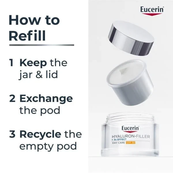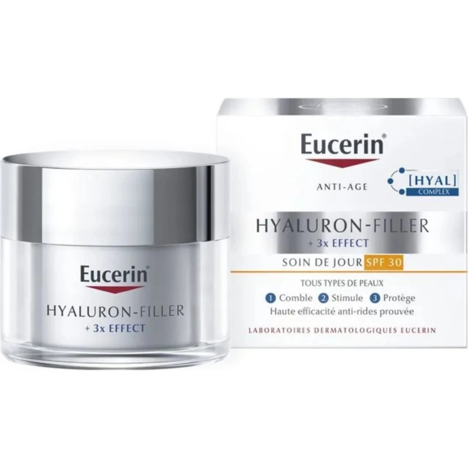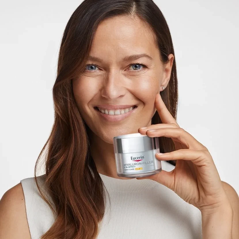 Eucerin Hyaluron-Filler +3x Effect Day Cream SPF 30 is an advanced anti-aging moisturizer that targets fine lines and deep wrinkles. With its unique triple action formula, it fills, stimulates, and defends the skin: high and low molecular Hyaluronic Acid hydrate and plump the skin, Glycine Saponin supports the skin’s natural collagen production, and Enoxolone helps protect Hyaluronic Acid degradation. Enriched with SPF 30, it also protects the skin from harmful UV rays and premature aging. Benefits: